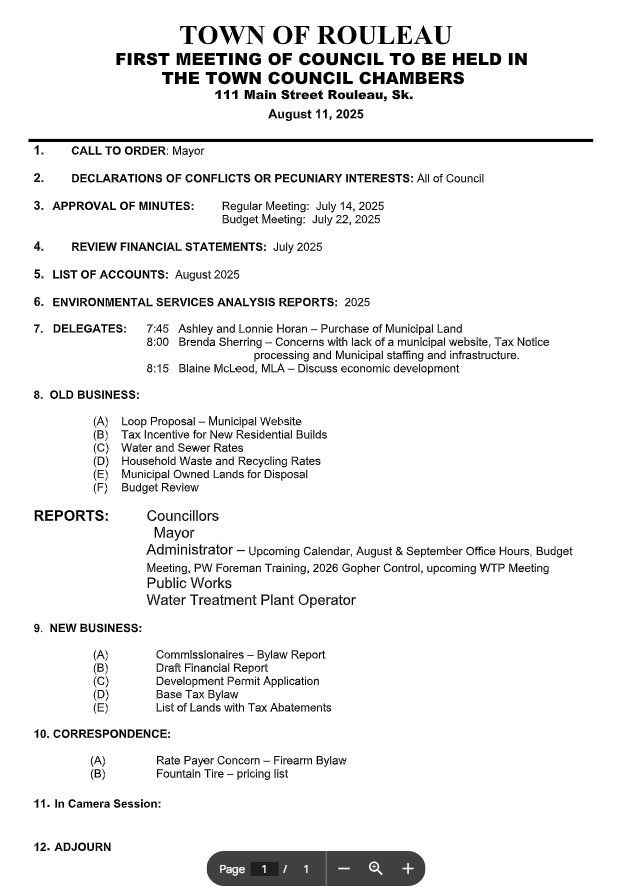 Find the approved meeting minutes for the July 2025 Rouleau Town Council meeting attached. If there are any discrepancies between this posted copy and the one at the town office, the copy at the town office will be considered correct.